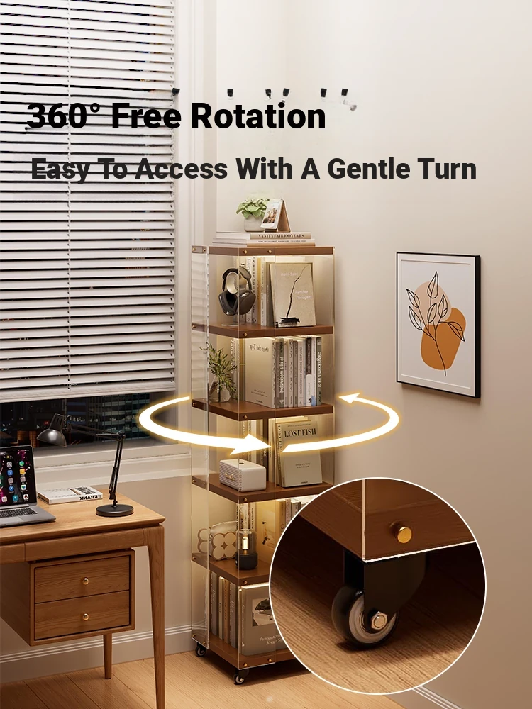 360-Degree Rotating Bookshelf with Wheels - Versatile Floor Storage Cabinet, Wall-Mounted, Multi-Layer Organizer for Efficient Space Saving and Stylish Home Decor.