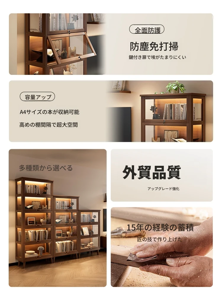 ガラス扉付きの無垢材書棚 - 家庭用リビング展示キャビネット、テレビ台、扉と鍵付きの防塵サイドキャビネット。高級感あふれるデザインで、大切な本やコレクションを美しく収納!