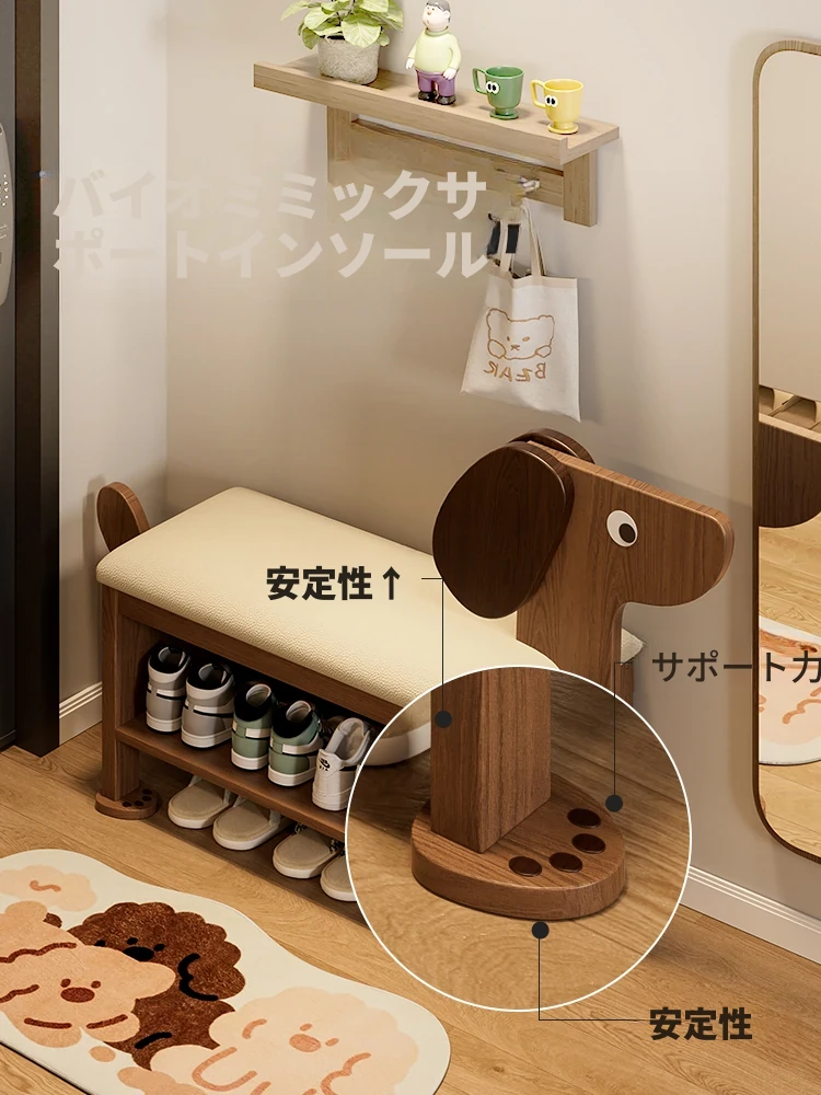 かわいいデザインの無垢材小犬シューズラック兼用ベンチ - 入り口や玄関に最適!おしゃれで実用的なシューズボックス、家族みんなで使える便利な靴を履くためのベンチです。