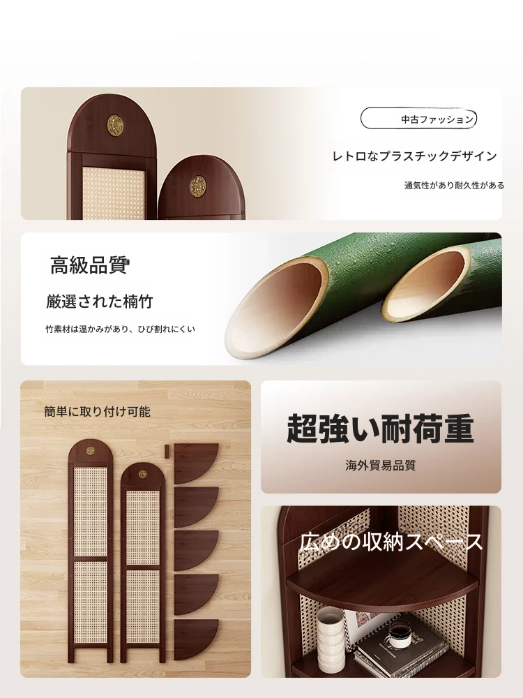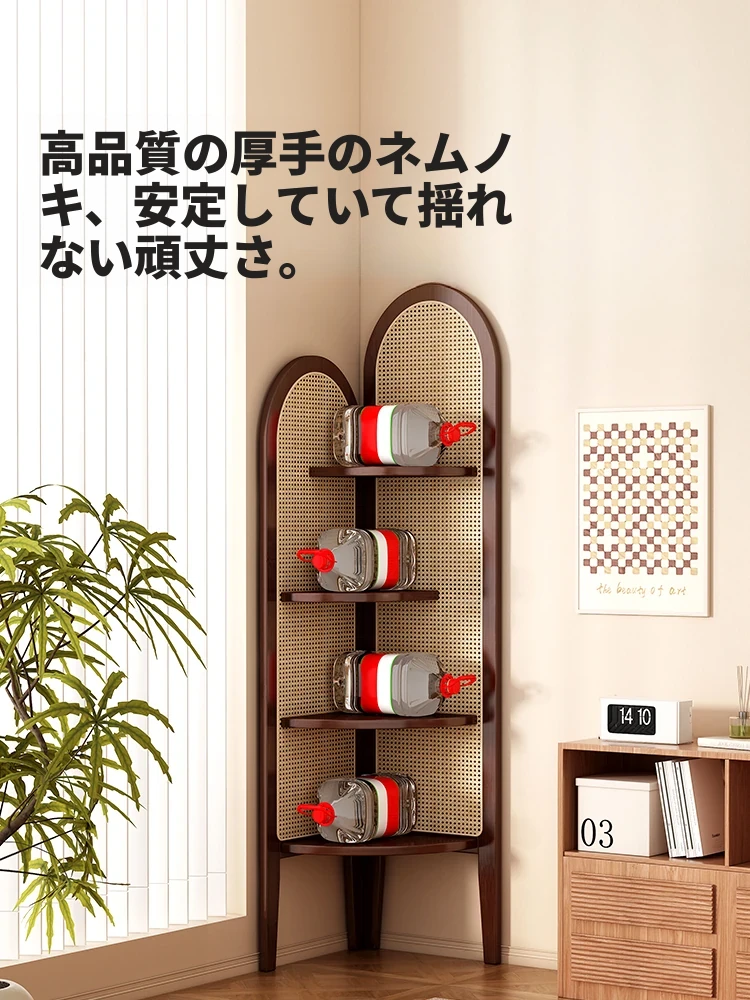 2024年新作!レトロな中古風のバスケット編みコーナー収納ラック - リビングの壁際にぴったりな三角形の無垢材キャビネット!おしゃれで機能的なインテリアを実現!