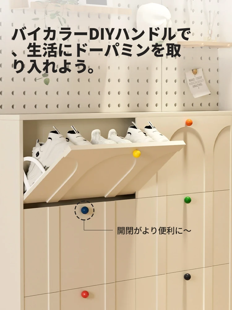 超薄デザインの翻斗式シューズキャビネット - クリームカラーでおしゃれ!家庭用の玄関にぴったりなスリムな靴箱、スペースを有効活用できる収納力抜群の一体型シューズラックです。あなたの玄関をすっきりと整理整頓!